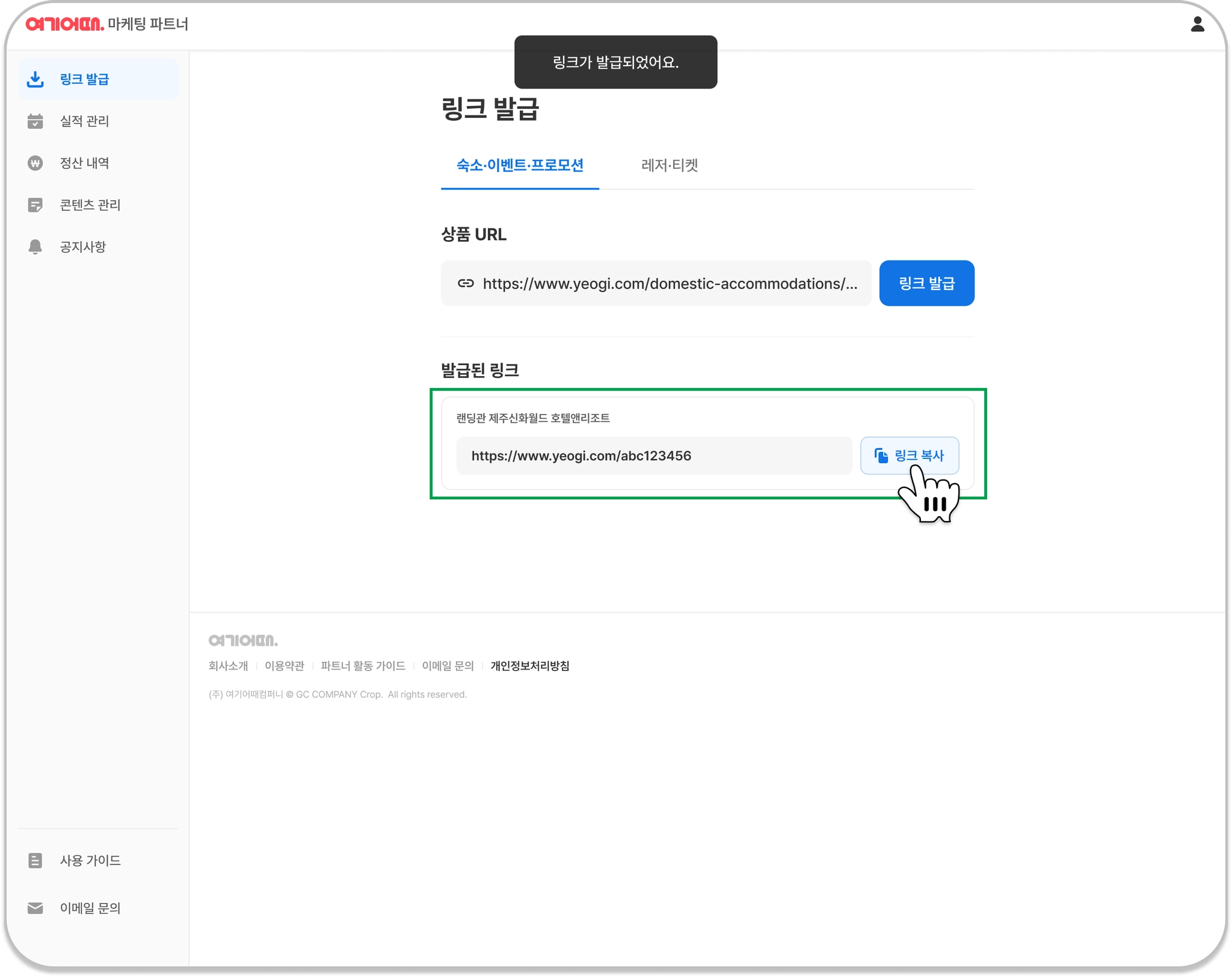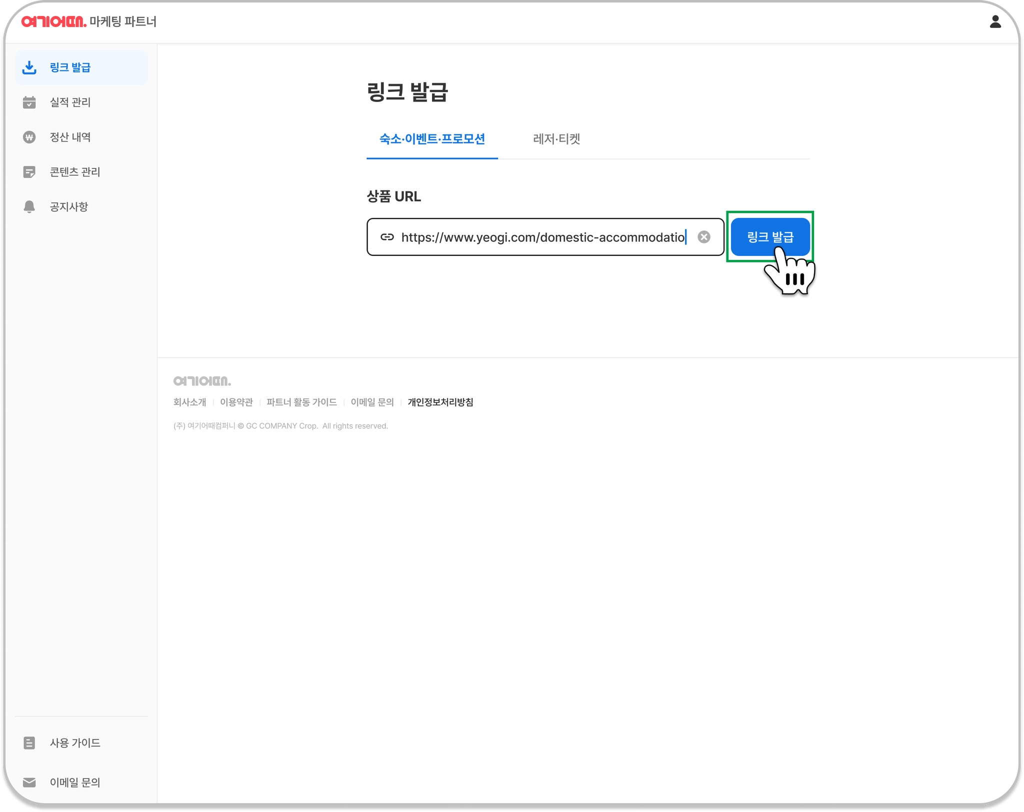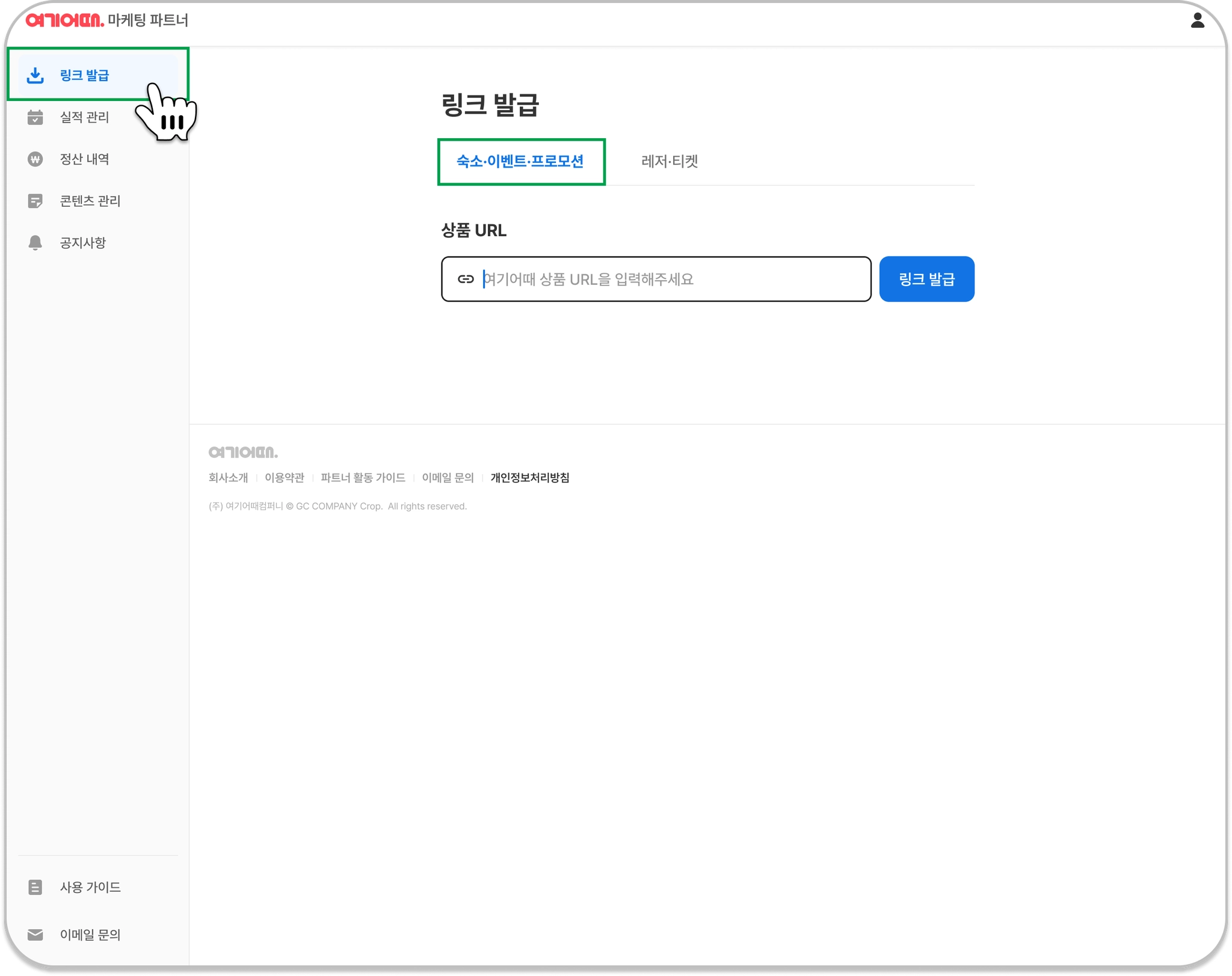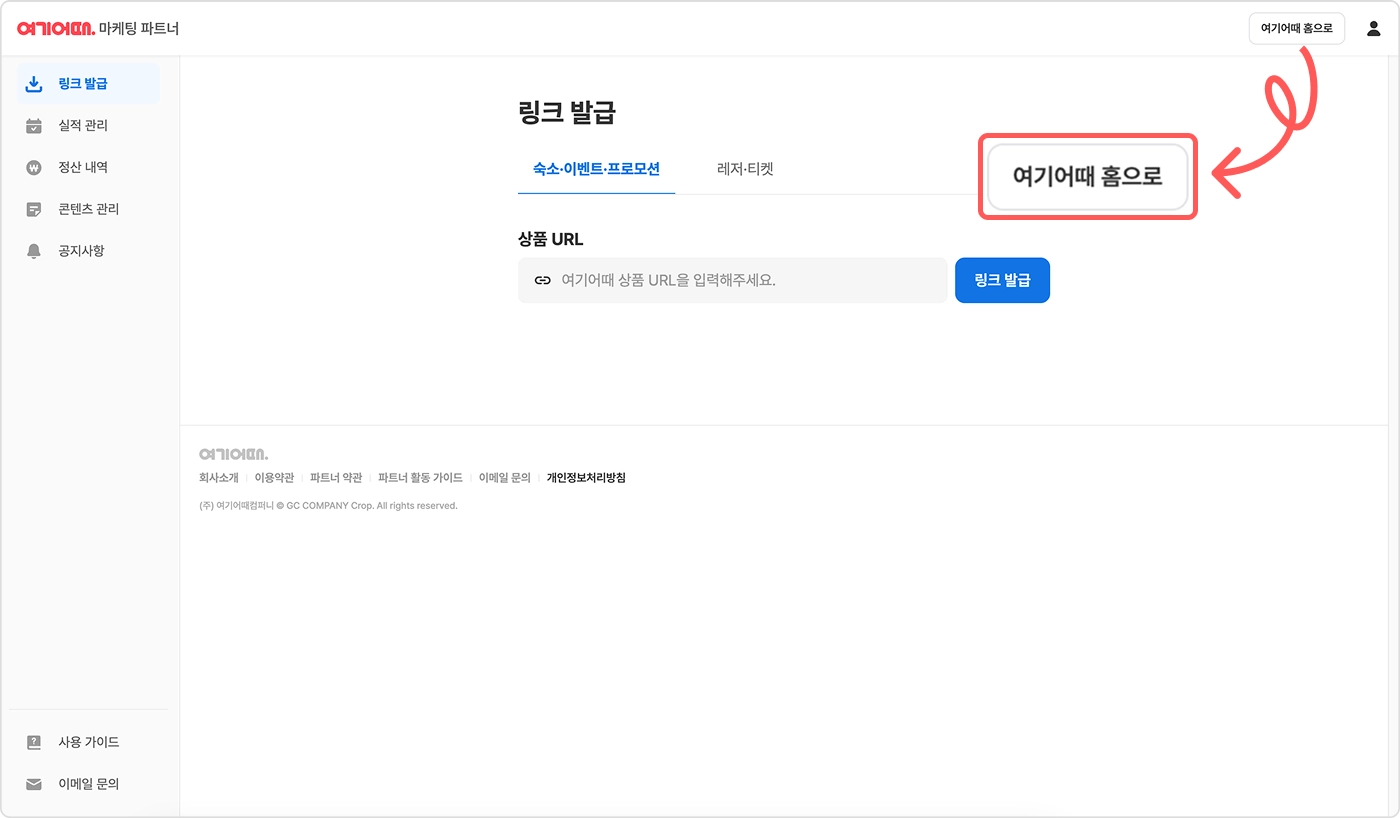 콘텐츠에 삽입할 상품 링크를 발급해보세요. 마케팅 파트너 우측 상단의 ‘여기어때 홈으로’를 클릭하면, 여기어때 홈페이지로 바로 이동합니다.