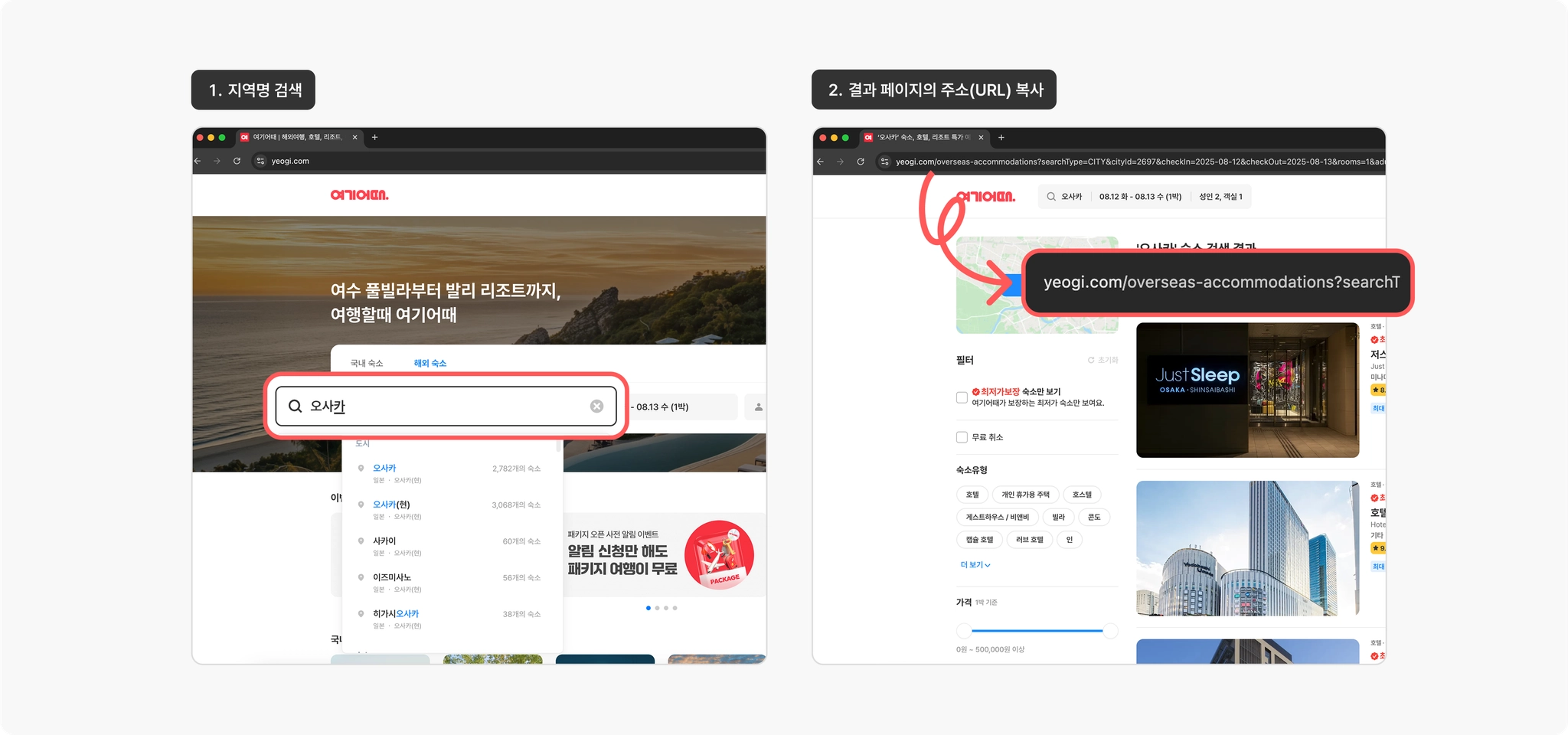 국내, 해외 지역별 숙소 리스트 페이지 URL 복사