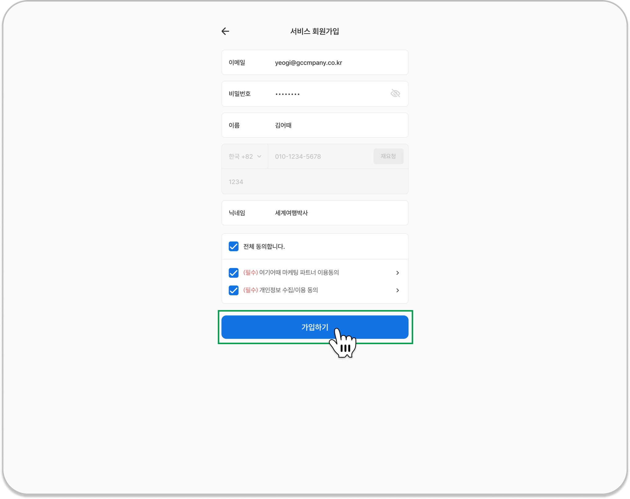 입력 후 필수 약관 동의를 체크하고 가입하기 버튼을 눌려주세요.