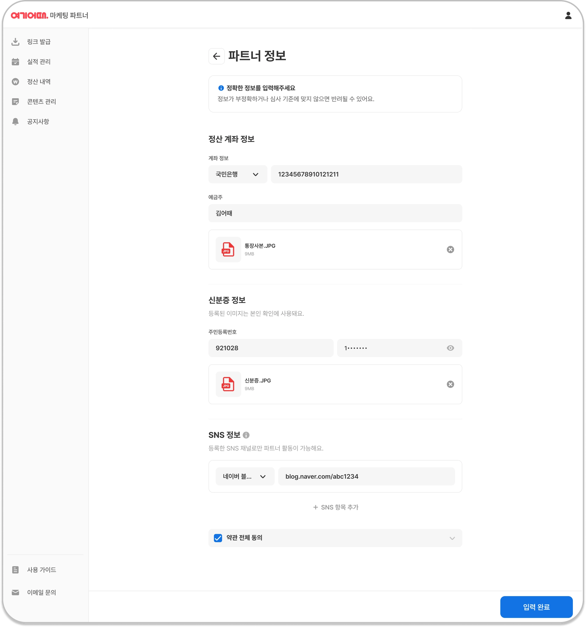 버튼을 누르면 파트너 정보 심사가 진행됩니다.