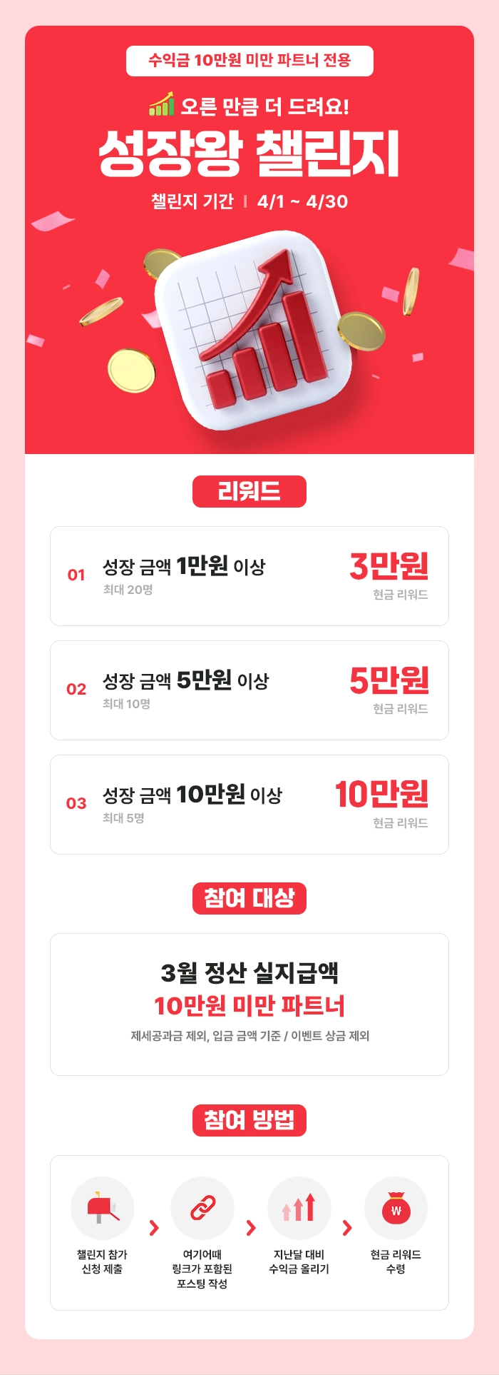 본 챌린지는 2026년 3월 정산금액 10만원 미만 파트너 전용 챌린지입니다. 대상 조건에 해당하지 않는 경우 선발 대상에서 제외됩니다.