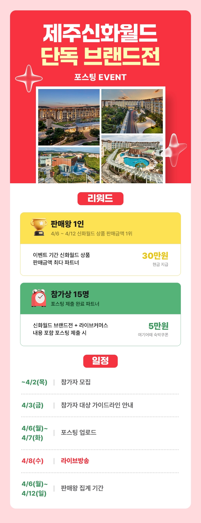 4/6(월)~4/12(일) 제주신화월드 역대급 특가가 진행됩니다. 선발되지 않으셔도 해당 기간 자유롭게 콘텐츠를 발행하시면 판매 수익을 올릴 수 있어요.